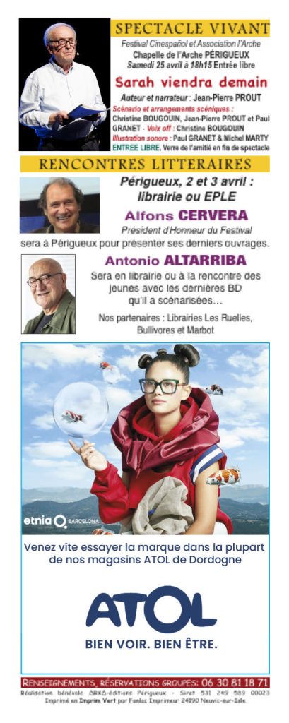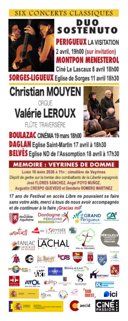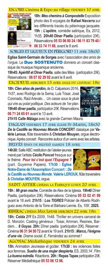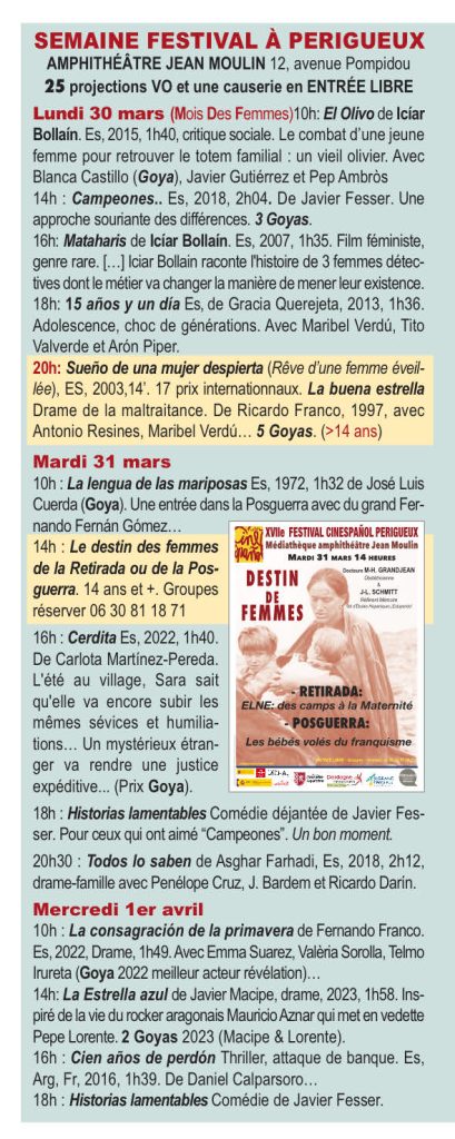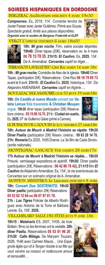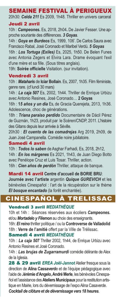 La Programmation XVIIe FESTIVAL CINESPAÑOL EN DORDOGNE 2026Actions culturelles gratuites Le programme complet :